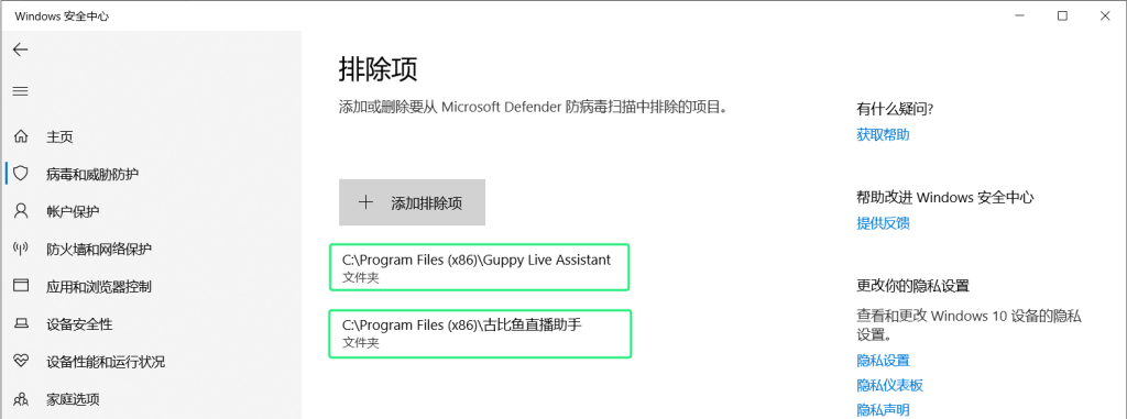 点击电脑系统设置–更新和安全–Windows安全中心–病毒和威胁防护–“病毒和威胁防护”设置–管理设置–添加或删除排除项–添加排除项–选择安装目录的文件夹(Guppy Live Assistant 或 古比鱼直播助手)–添加成功